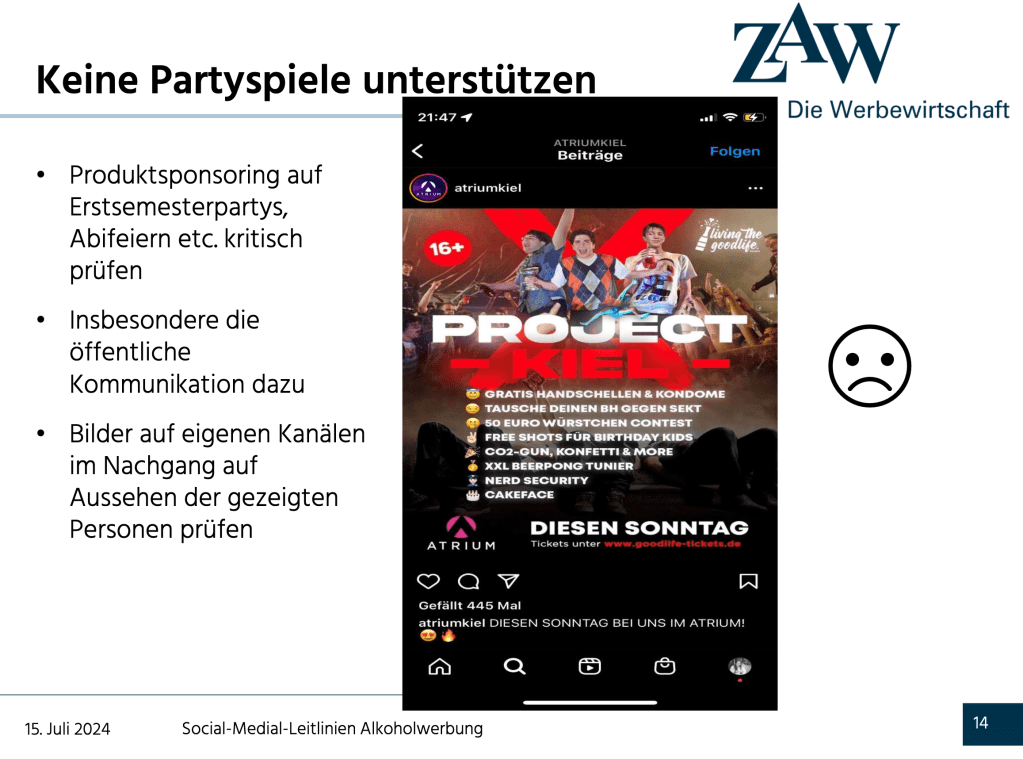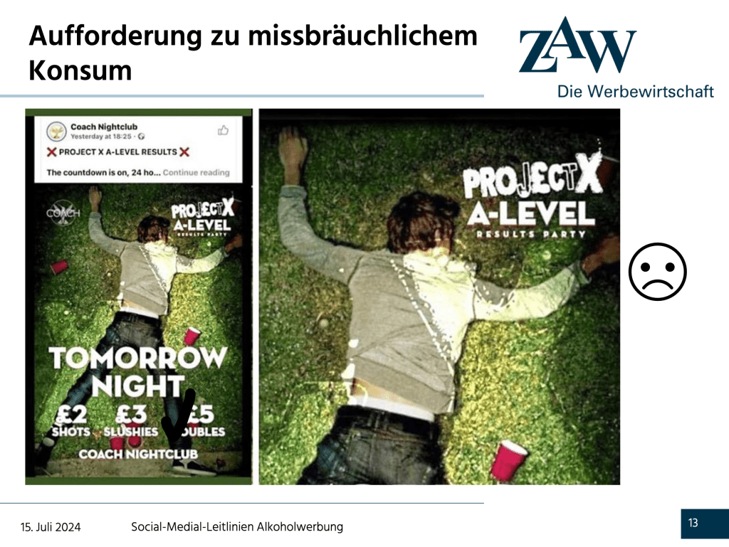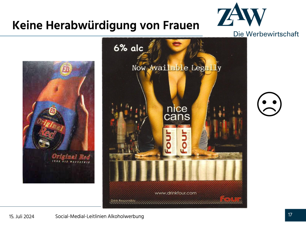 Aber nun gut, Humor muss sein! Und früher sagte man, dass Satire alles dürfe. Heute wohl nicht mehr, aber früher war das Gras halt irgendwie grüner und noch nicht so pestizidbelastet, genmanipuliert, aber lassen wir das … Jedenfalls bin ich über eine Präsentation des «Zentralverband der deutschen Werbewirtschaft ZAW» bezüglich der neuen Leitlinien gestolpert. Darin zeigt die Geschäftsführerin Katja Heintschel von Heinegg (geradezu ein royaler Superheldinnen-Namen!) schlechte, gaaaanz böse Beispiele von Alkoholwerbung. Diese sind jedoch so lustig, dass ich sie Euch nicht vorenthalten möchte! Let’s go: