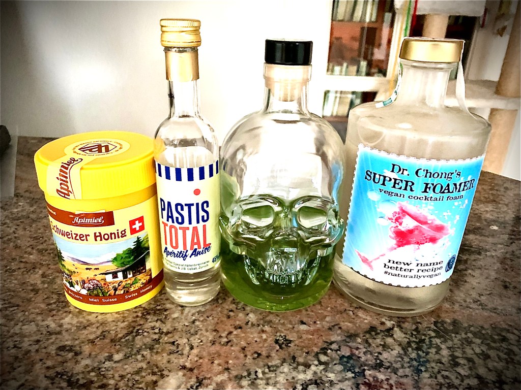 Anisette ist ein Likör, der süsslich ist. Das fehlt aktuell in meiner Bar (unglaublich, ich weiss … :-)). Also nehme ich einen Pastis, der nicht Likör-süss ist und mit höherem Alkoholgehalt daher kommt als Anisette, füge mit ein wenig Honig jedoch etwas Süsse hinzu. Der vegane Eiweiss-Ersatz ist ebenfalls ein heimisches Produkt, wie natürlich auch der Absinthe, der sich an Motorradfahrer wie auch Eishockey-Fans richtet. Ich reite keine Harley, bin aber Die-Hard-Eishockey-Fan, und das ist für mich ein starker Bezug, den ich zu diesem Land habe, in das ich geboren wurde.