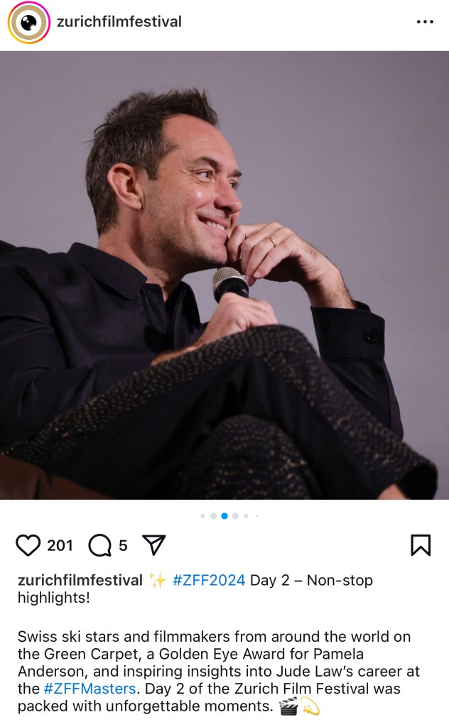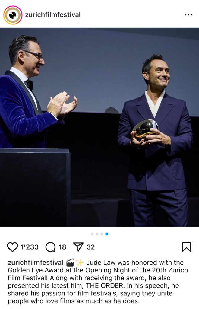 Eine andere Frage war, wie er Beruf und Familie unter einen Hut bringe. Jude hat eine grosse Familie mit, wenn ich es richtig hörte, sieben Kindern. Er antwortete, dass er von Paul Newman bei den Dreharbeiten zu Road to Perdition (2002) einen guten Rat bekommen habe. Er solle sich vorstellen, dass er quasi einen Job beim Wanderzirkus habe, er soll es geniessen, aber seine Familie daran teilnehmen lassen, sie so oft mitnehmen, wie es geht. Und Jude habe die Regel, dass, wenn er doch einmal alleine weg müsse, das nicht zu lange dauern darf, ein ungefähres Maximum von zwei Wochen.
