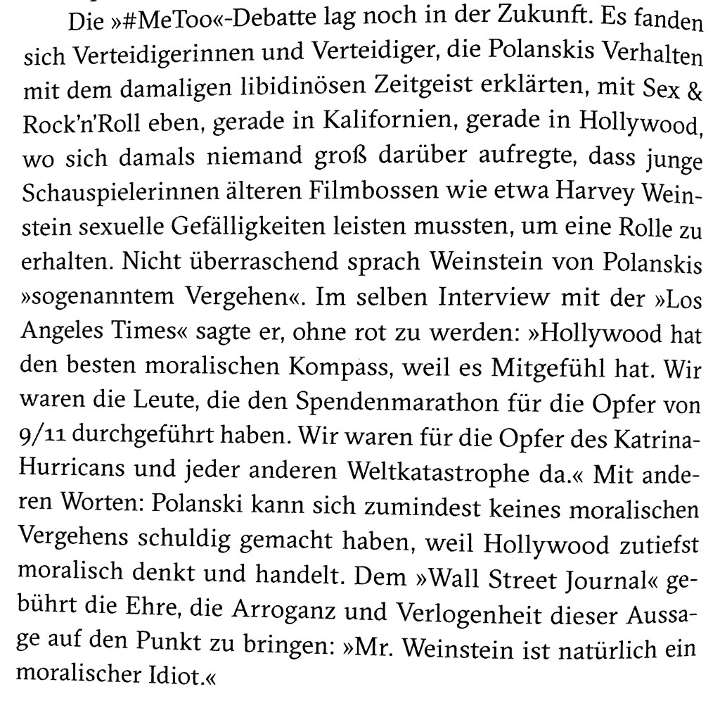 Und der letzte Buchausschnitt soll nochmals zwei der prägensten Figuren des Festivals behandeln, Polanski, dessen Verhaftung die Bekanntheit des ZFF über Nacht durch die Decke gehen liess sowie der schwierigste Gast der Festivalgeschichte, Harvey Weinstein: