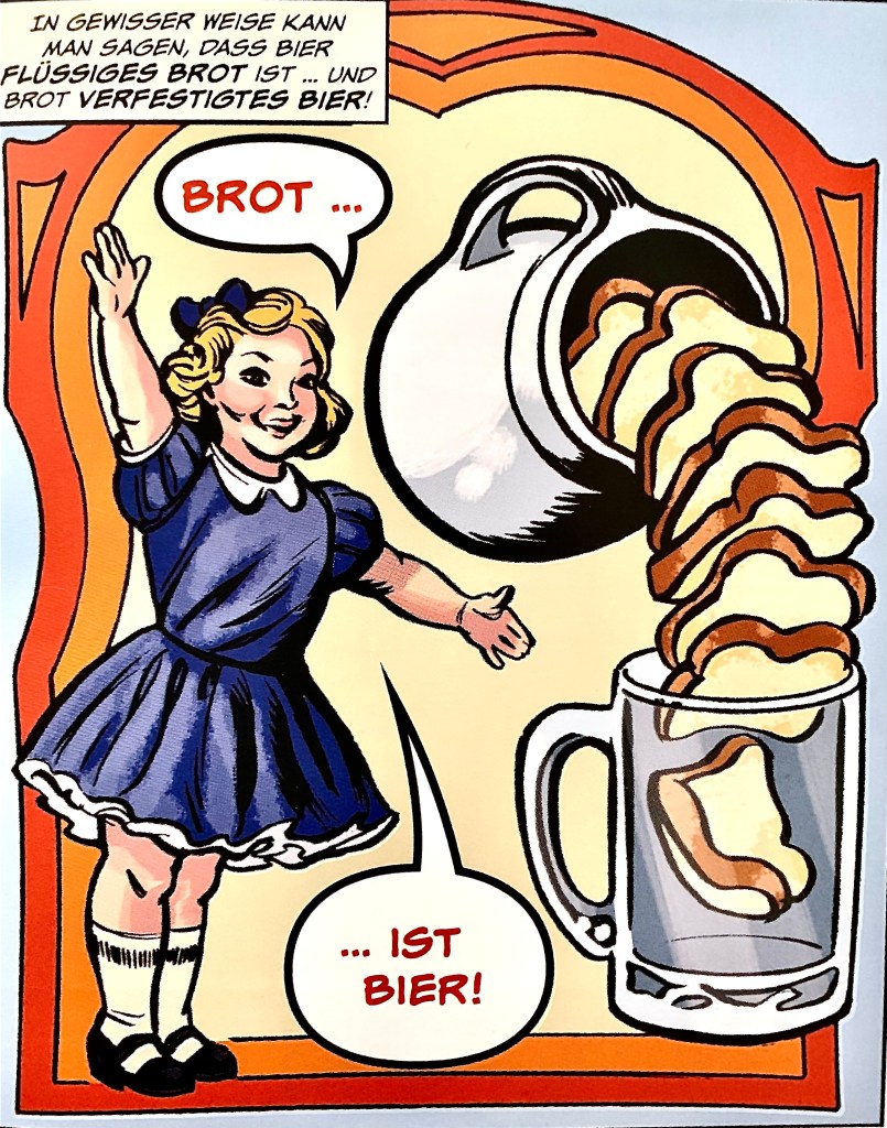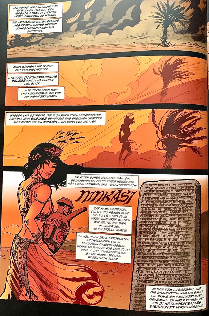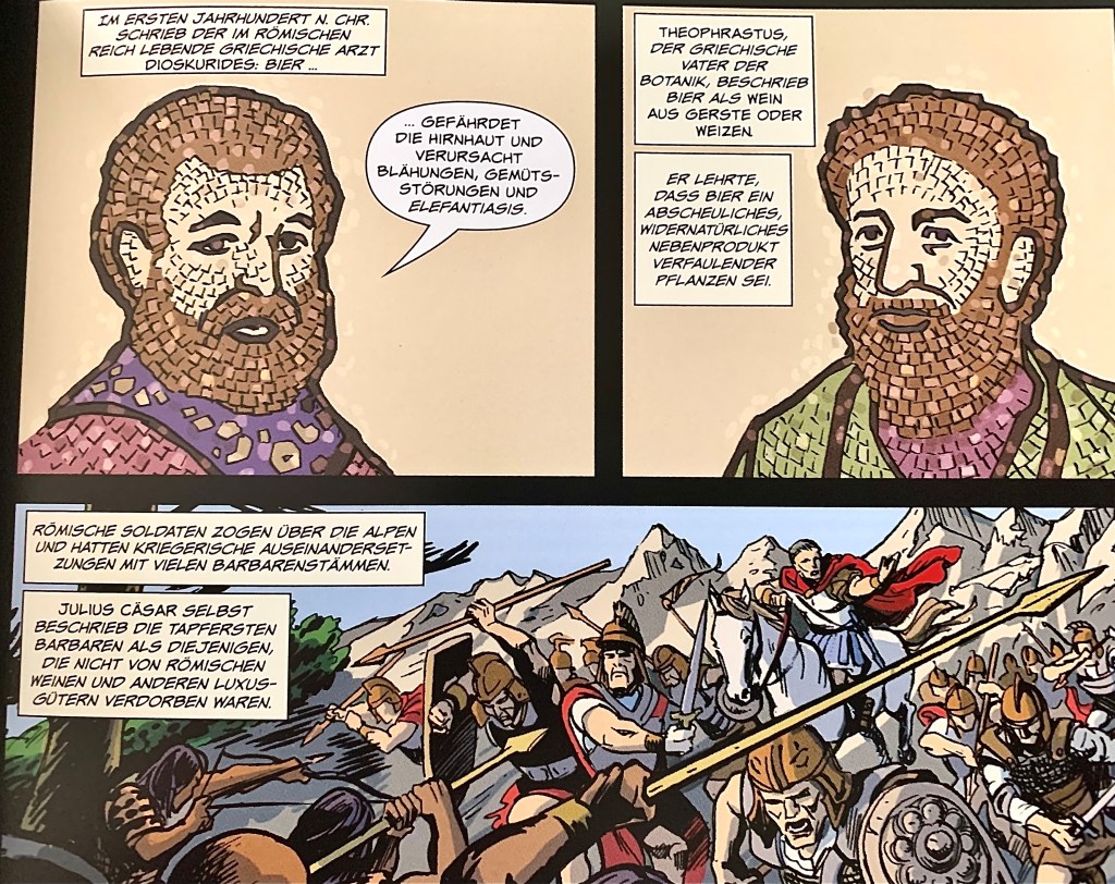 Diese 170 Seiten strotzen also vor informativer Power, doch auch grafisch ist das Buch eine Wucht und äusserst abwechslungsreich, nie langweilig, und auch der Humor kommt nicht zu kurz. Ausserdem gefällt mir eine gewisse Demut, dass man trotz des offensichtlichen Fachwissens auch erwähnt, wenn man etwas nicht weiss, nicht wissen kann. Wissenschaft ist gut und recht, doch überdauern nicht alle Artefakte und Botschaften die Zeit. Einen ganz konkreten Ursprung des Gerstensafts kann man insofern nicht bieten und das wird auch offen konstatiert.