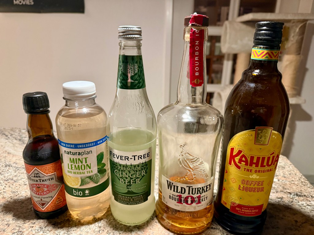 - Minze-Zitrone-Kräuter-Tee, ungesüsst – Das ist die quantitative Hauptzutat. Minze und Zitronen (resp. Limetten) sind klassische Zutaten und passen auch hier hervorragend, selbst in Kombination mit etwas Kaffee-Likör.